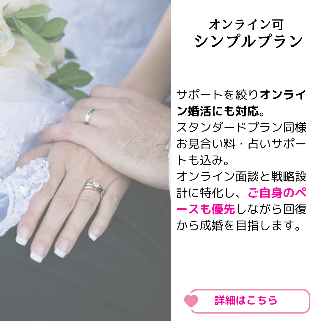 運気の流れや相性、人生の節目といった「目には見えない要素」も大切にしながら、あなたが本当に幸せになれるお相手選びを、現実的かつ戦略的にサポートいたします。