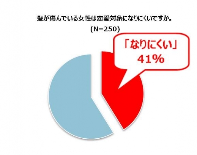 そして髪が痛んでいる女性は恋愛対象になりにくいか?という質問に対してはなんと41%の男性がYESと答え、髪のダメージが想像以上に恋愛に関係していることがわかります。