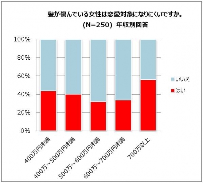 さらに年収が700万円以上のいわゆる高収入な男性になるとますますその割合は大きくなり、約半数の男性が髪の痛んだ女性は恋愛対象になりにくいと答えています。