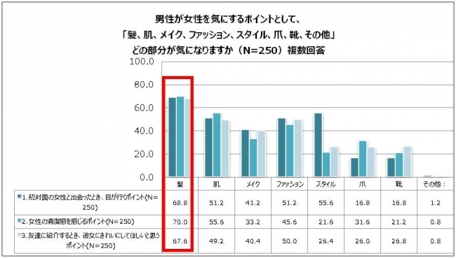 そのなかで「女性の髪・肌・メイク・ファッション・スタイル・爪・靴・その他」、の中で「男性が女性を気にするポイントをどこか?」というものがあります。